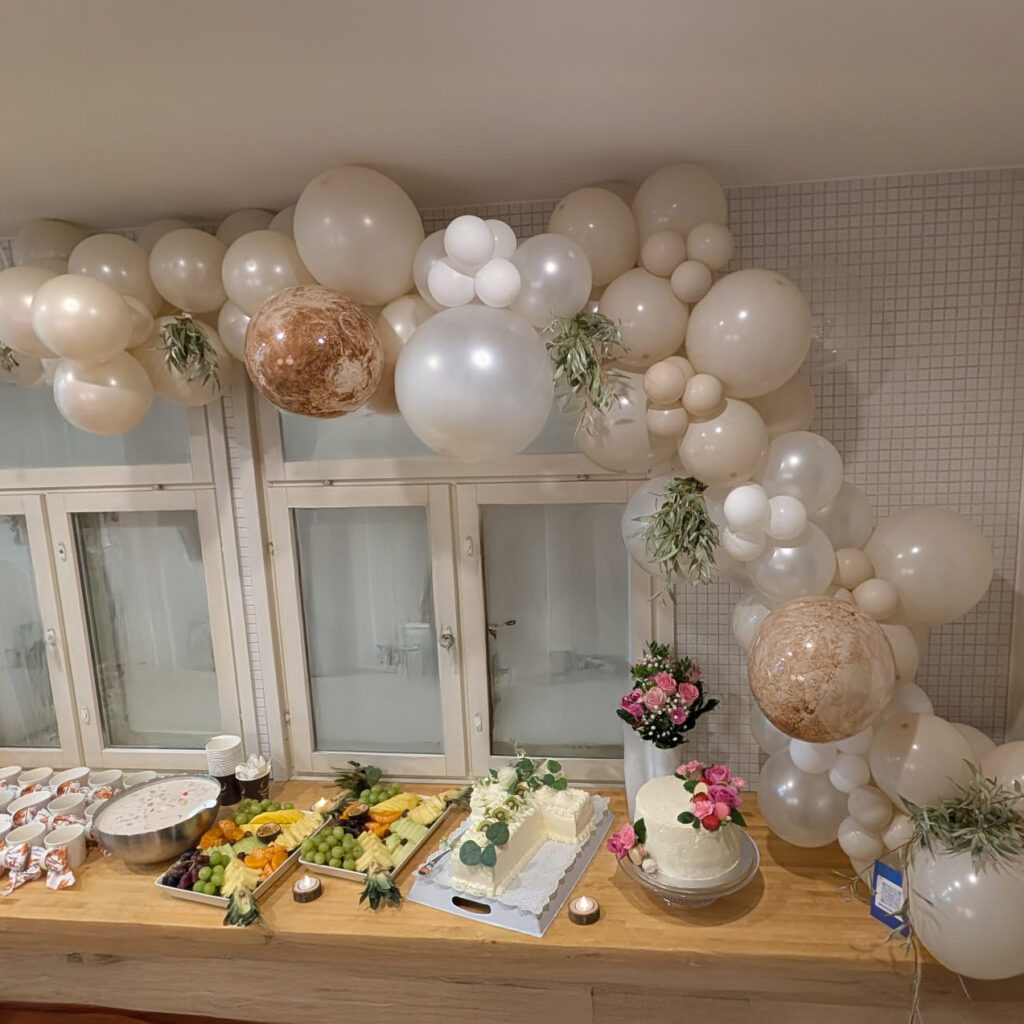Kaunis ilmapallokaari joka kruunaa kattauksen.